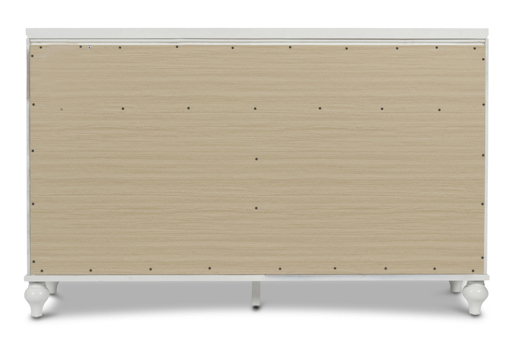 Discover the Valentino 9 Drawer Dresser—a marvel of durable craftsmanship crafted from a blend of manufactured and solid woods, adorned with exquisite embossed inlays. Radiating with glitz and glam, its gleaming finish, mirrored trims, crystal-studded drawer pulls, and alligator-embossed accents capture the essence of Hollywood allure. Delight in its thoughtful details, from heirloom-crafted English dovetailed drawers with snag-free interiors to smooth full-extension ball-bearing glides. With an abundance of storage, this dresser offers ample space to organize your clothing and belongings effortlessly. Experience luxury and functionality combined in this unparalleled piece of furniture.