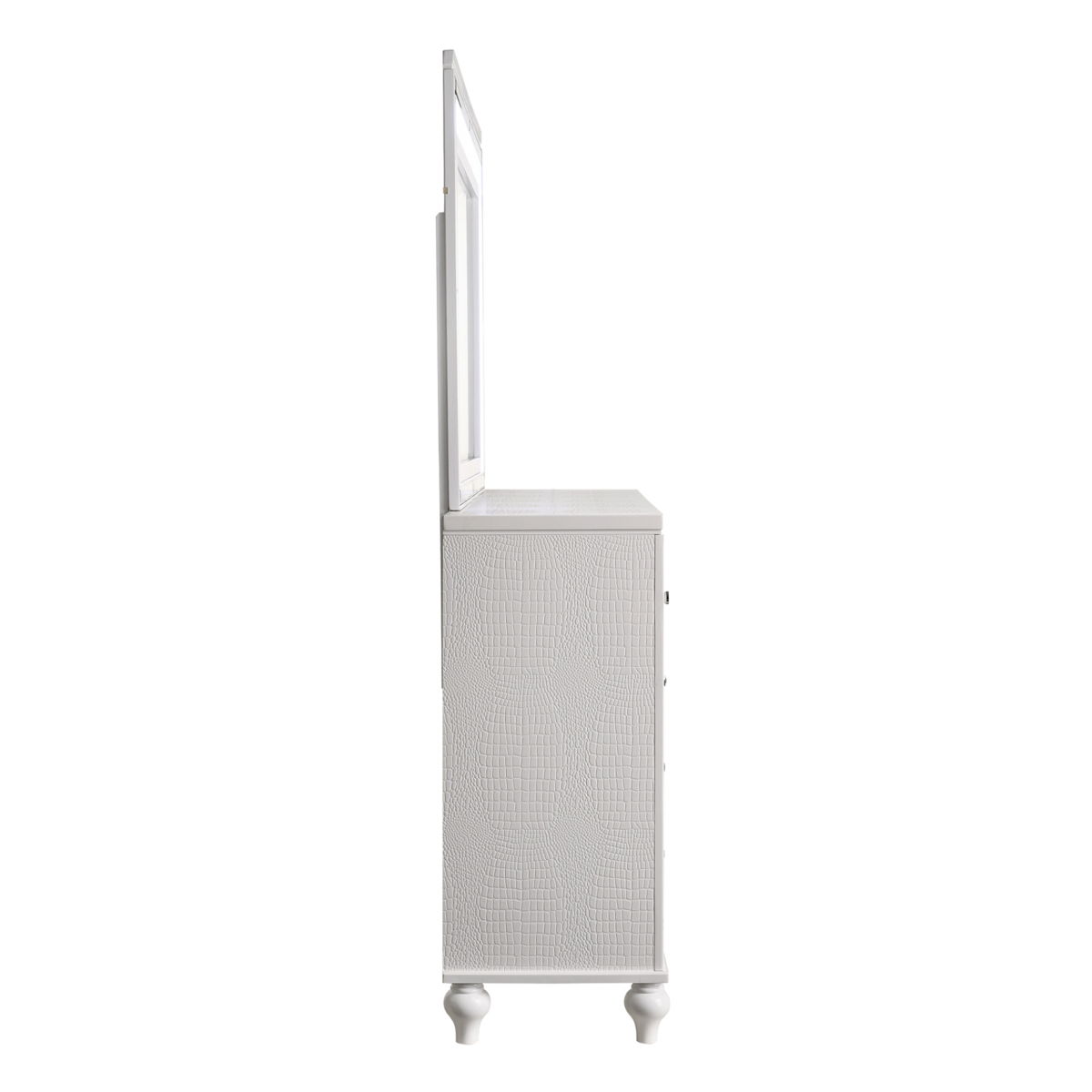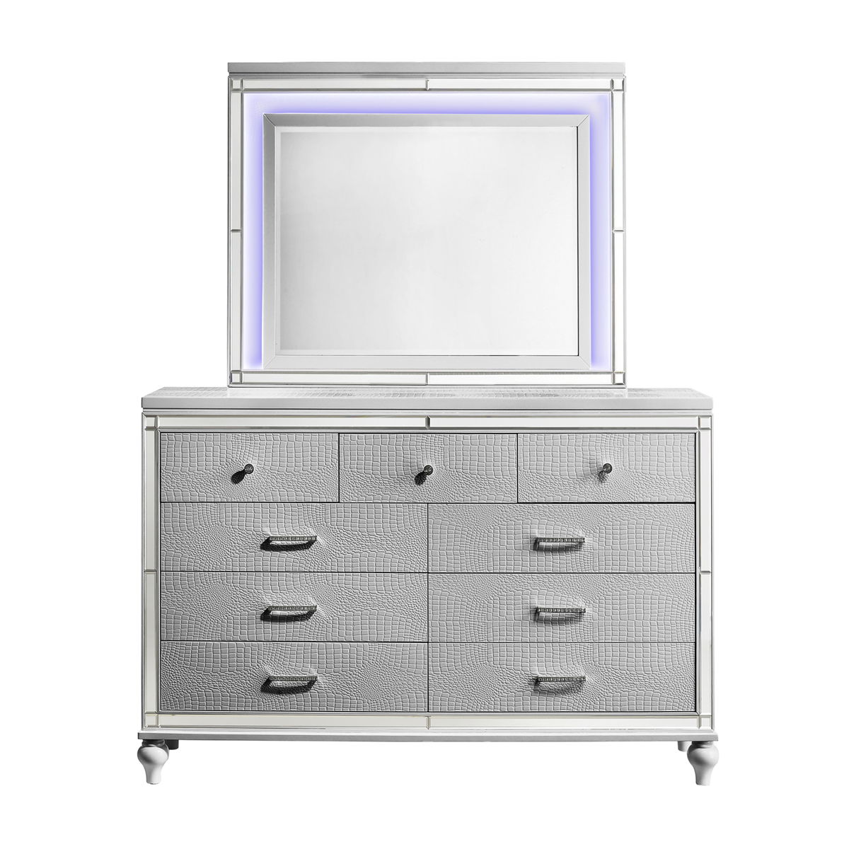 Introducing the Valentino Lighted Dresser Mirror—a testament to enduring craftsmanship crafted from a blend of manufactured and solid woods, accentuated by intricate embossed inlays. Revel in its glitz and glam, featuring a gleaming finish and mirrored trims that exude Hollywood allure. Elevate your space with its mood-enhancing soft LED lighting, casting a warm ambience for intimate moments. Experience the perfect fusion of durability, elegance, and functionality with this distinctive piece that promises to transform your dressing area into a sophisticated sanctuary.
