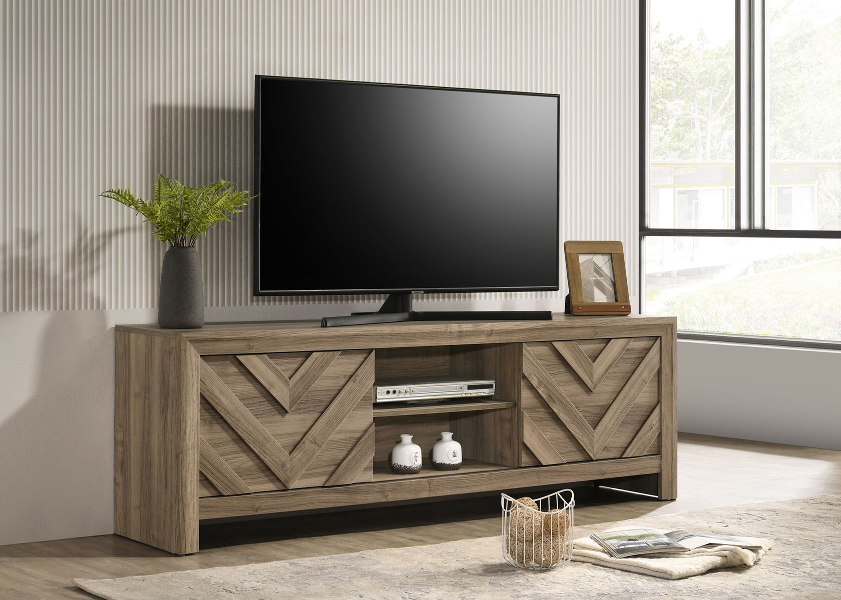 This bedroom collection encapsulates a blend of contemporary design and rustic charm. The centerpiece, a bed with a distinguished chevron patterned headboard, evokes a sense of craftsmanship and texture, infusing the space with character. Flanking the bed are matching pieces, each exhibiting clean lines and a finish that suggests a lived-in elegance. The dresser, complemented by a substantial mirror, along with the tall chest, offer ample storage solutions with understated metal handles that enhance the modern farmhouse aesthetic. A nightstand completes the set, its compact design making it a practical addition to the suite.