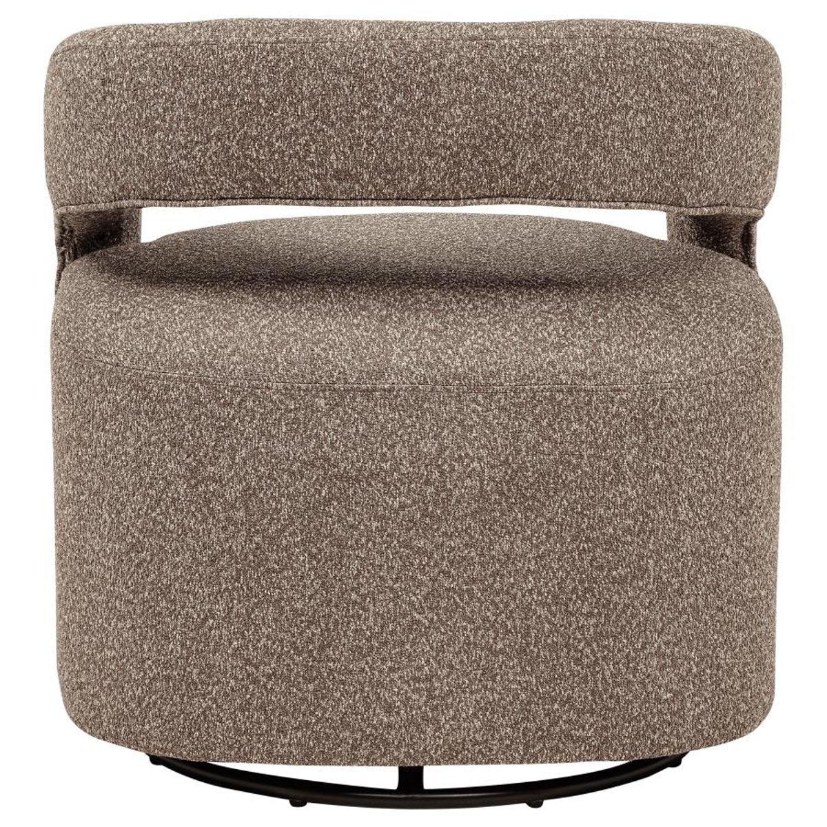 Curved form meets effortless movement in this modern swivel accent chair. With a rounded open back and tailored seat, it delivers sculptural balance and all-around comfort. Upholstered in textured boucle and built on a hidden swivel base, it glides smoothly to support dynamic living. Its compact footprint and graceful silhouette make it ideal for layering into lounge corners, reading nooks, or open floor plans seeking softness and versatility.