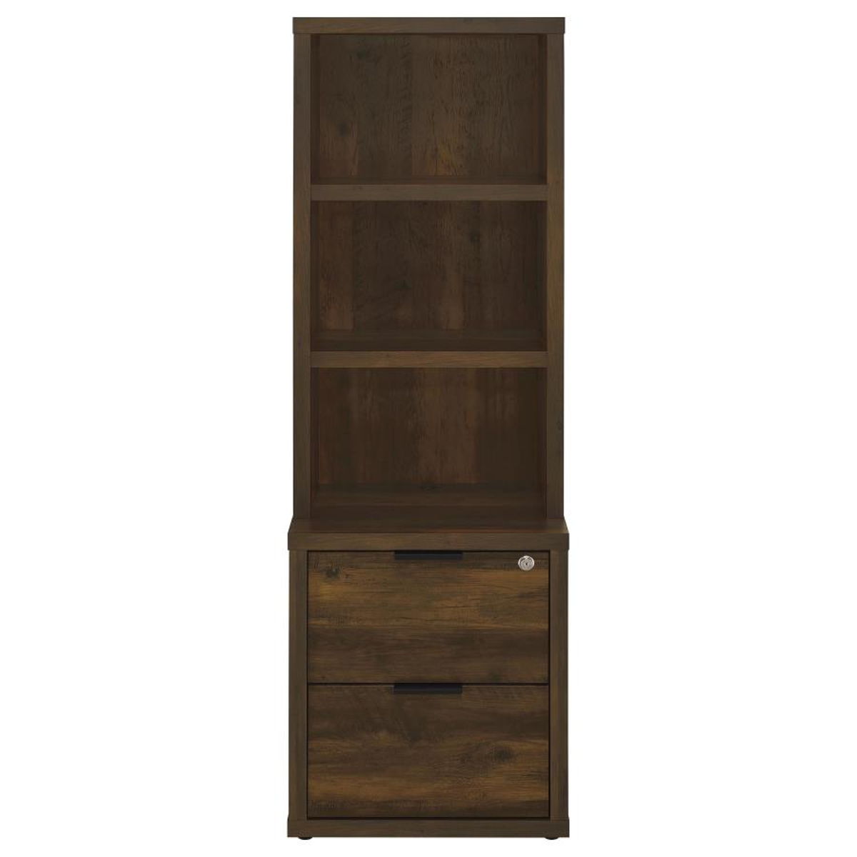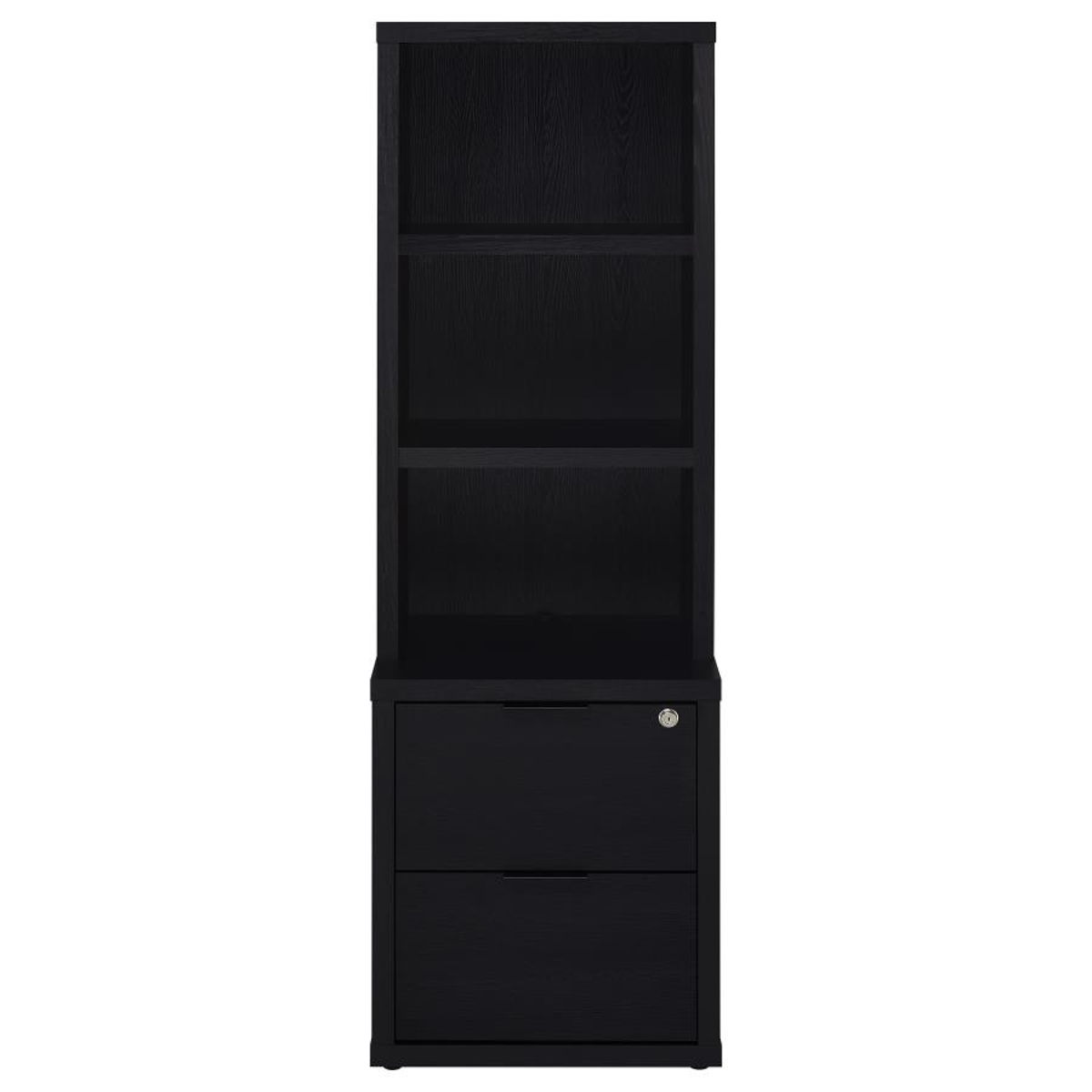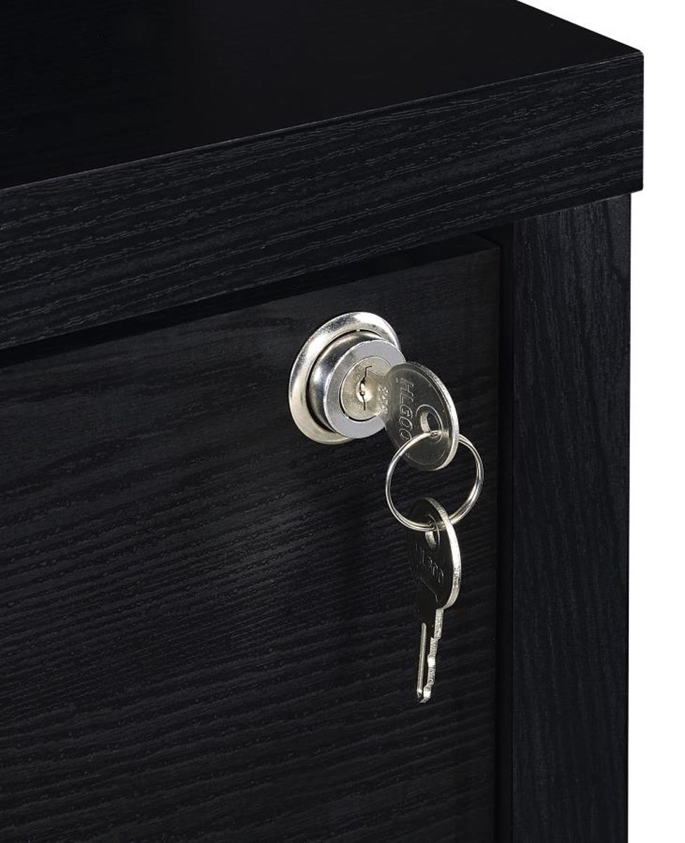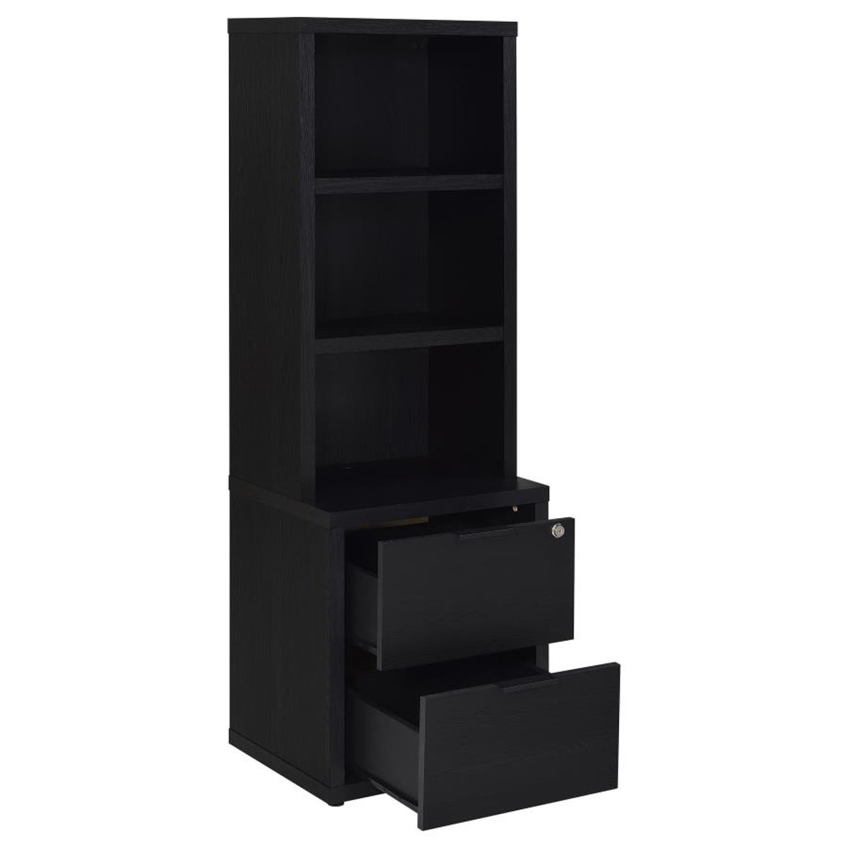 This 3-piece bedroom set includes a bookcase headboard and two coordinating nightstands designed for practical bedroom storage. Open cubbies on the headboard and hutches keep books and essentials within reach, while lockable top drawers add secure storage. Each nightstand features built-in USB-A and USB-C charging ports. Made from engineered wood and finished in a scratch-resistant laminate veneer, the set delivers durability and everyday convenience across a range of room styles.