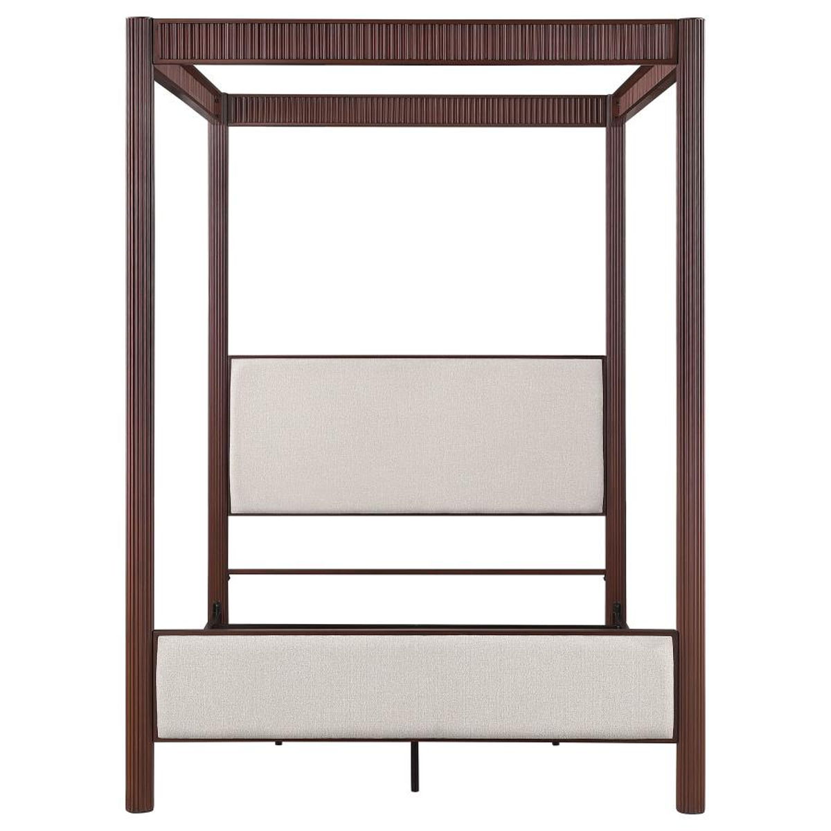 Transform your bedroom with this modern canopy bed that combines industrial strength with elegant design. Constructed entirely from sturdy metal, the frame is finished in a rich rust brown that highlights its contemporary appeal. Upholstered panels on the headboard and footboard are wrapped in soft beige fabric, providing a comfortable contrast to the robust frame. The vertical grooves along the posts add a textured touch, while the open canopy design creates an airy and spacious feel. This bed offers the perfect balance of durability and style, making it an ideal centerpiece for any modern bedroom.