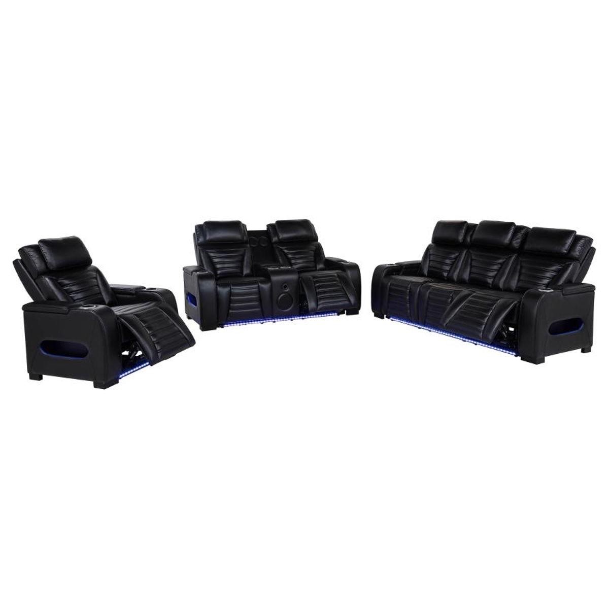 Designed for immersive relaxation, this dual power reclining set combines bold styling with high-tech comfort. Power recline and adjustable power headrests offer personalized positioning, while integrated control panels include USB-A, USB-C, and a home button for effortless use. Blue LED under glow casts a modern glow beneath each piece. With built-in cup holders, storage, and tech-forward features like a Bluetooth speaker and charging console, this set redefines luxury lounging.